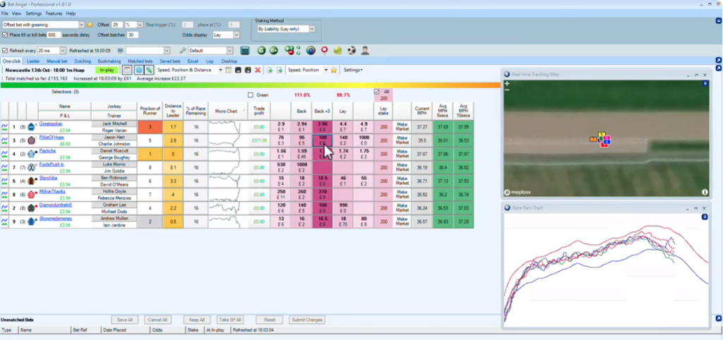 Then in 2021 along came a huge shift in in-running horse trading. Bet Angel and TPD announced a tie-in which meant for the first time live GPS data could be displayed almost instantaneously along with the existing data flow on my Bet Angel ‘One-click’ screen. Suddenly I had the position, speed, distances, stride frequency and more, of every horse in the race flashing on my screen and a whole new world of data was unleashed.